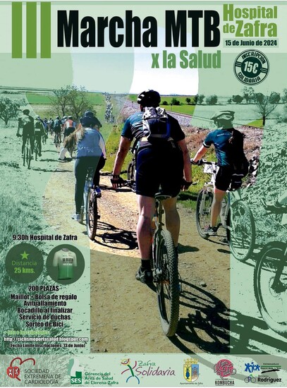 La Sociedad Extremeña de Cardiología y la Gerencia del Área de Salud Llerena-Zafra, en colaboración con el Ayuntamiento de Zafra y patrocinadores, han organizado la III Marcha MTB x la Salud Hospital de Zafra, que se desarrollará el próximo sábado 15 de junio a las 9.30 horas.