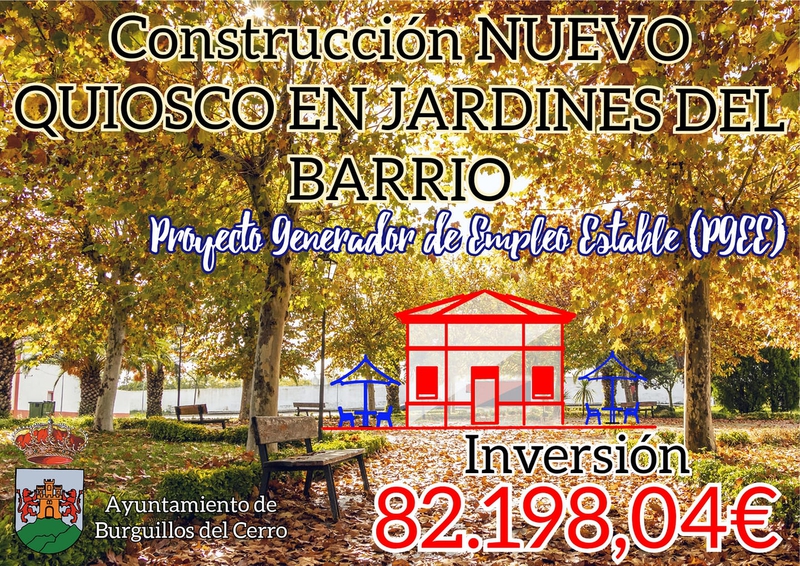 El proyecto establecido por el Ayuntamiento de Burguillos del Cerro, enmarcado los Programas Generadores de Empleo Estable, consistirá en la construcción de un quiosco multiusos dotado de una terraza perimetral. Su ubicación está próxima a las instalaciones deportivas de la localidad, concretamente en el centro del jardín de la calle Pedro de Valdivia.
