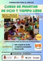 El Ayuntamiento de Los Santos de Maimona, a través de la Universidad Popular Santeña, convoca una nueva edición del Curso de Monitor de Ocio y Tiempo Libre, en su modalidad online.